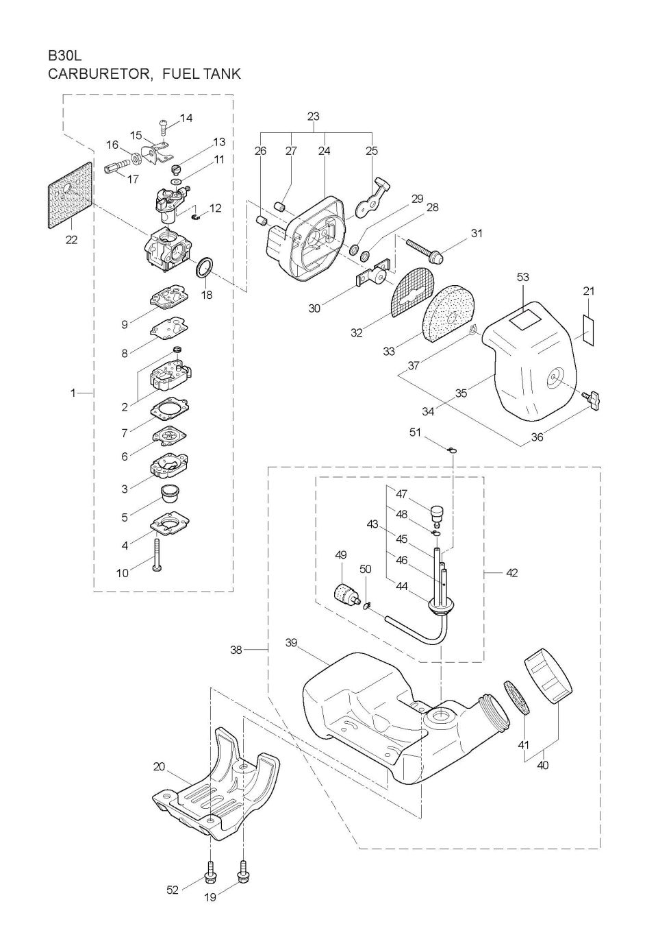 Thank you for shopping at MaruyamaParts.com and for using the parts lookup system to find parts for your B30L. You have selected the Carburetor, Fuel Tank diagram for the Maruyama B30L Trimmers and Brushcutters. Below you will find an interactive part diagram for the B30L Carburetor, Fuel Tank. If you find the part in the diagram you need you may click on the item number in the diagram or find it in the parts list below the diagram. For the B30L parts not shown in this diagram you may select from one of the other B30L part assemblies or select a different Trimmers and Brushcutters altogether. Thanks for shopping with us at MaruyamaParts.com and for making us your source for Maruyama Trimmers and Brushcutters parts.