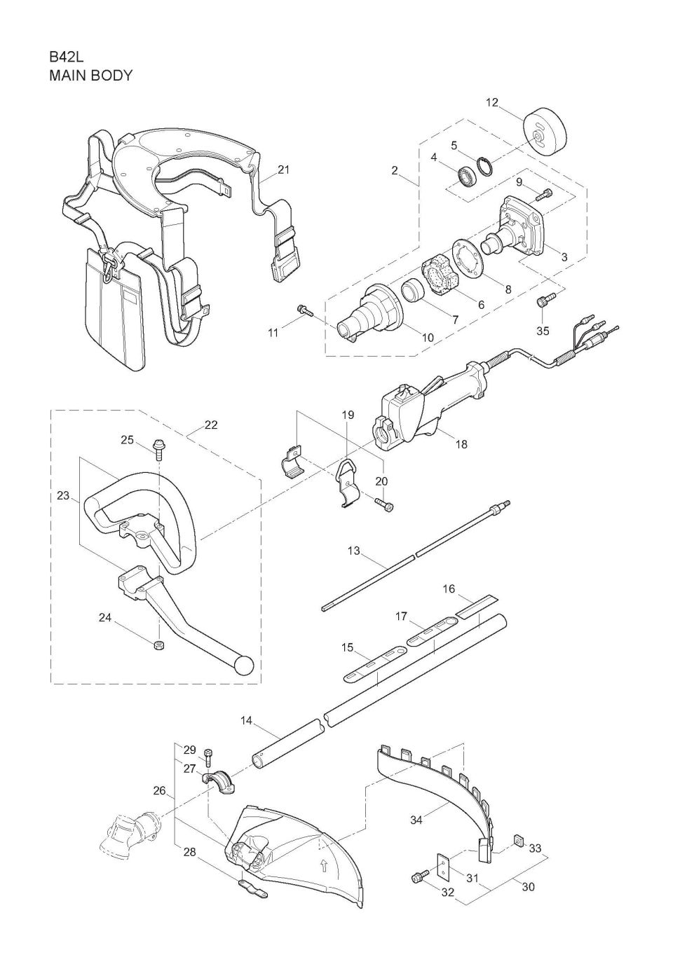 Thank you for shopping at MaruyamaParts.com and for using the parts lookup system to find parts for your B42L. You have selected the Main Body diagram for the Maruyama B42L Trimmers and Brushcutters. Below you will find an interactive part diagram for the B42L Main Body. If you find the part in the diagram you need you may click on the item number in the diagram or find it in the parts list below the diagram. For the B42L parts not shown in this diagram you may select from one of the other B42L part assemblies or select a different Trimmers and Brushcutters altogether. Thanks for shopping with us at MaruyamaParts.com and for making us your source for Maruyama Trimmers and Brushcutters parts.