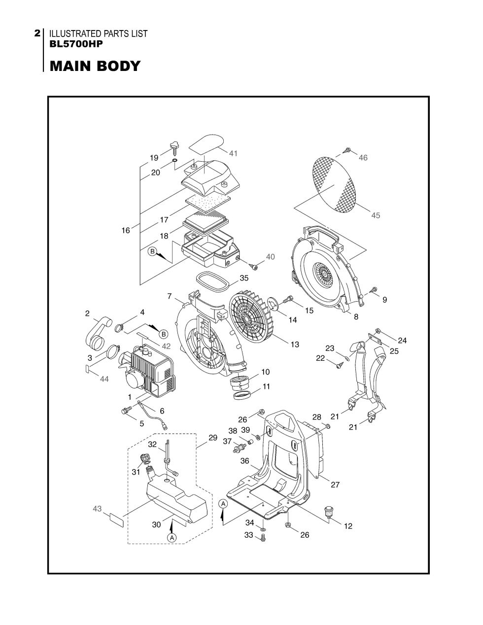 Thank you for shopping at MaruyamaParts.com and for using the parts lookup system to find parts for your BL5700HP. You have selected the Main Body diagram for the Maruyama BL5700HP Blowers. Below you will find an interactive part diagram for the BL5700HP Main Body. If you find the part in the diagram you need you may click on the item number in the diagram or find it in the parts list below the diagram. For the BL5700HP parts not shown in this diagram you may select from one of the other BL5700HP part assemblies or select a different Blowers altogether. Thanks for shopping with us at MaruyamaParts.com and for making us your source for Maruyama Blowers parts.