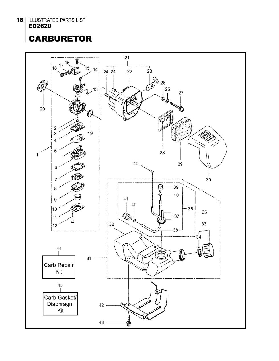 Thank you for shopping at MaruyamaParts.com and for using the parts lookup system to find parts for your ED2320, ED2620. You have selected the Carburetor (ED2620) diagram for the Maruyama ED2320, ED2620 Edgers. Below you will find an interactive part diagram for the ED2320, ED2620 Carburetor (ED2620). If you find the part in the diagram you need you may click on the item number in the diagram or find it in the parts list below the diagram. For the ED2320, ED2620 parts not shown in this diagram you may select from one of the other ED2320, ED2620 part assemblies or select a different Edgers altogether. Thanks for shopping with us at MaruyamaParts.com and for making us your source for Maruyama Edgers parts.