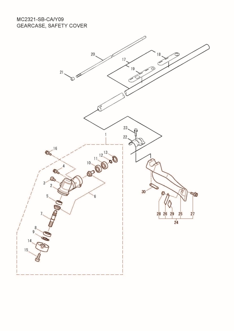 Thank you for shopping at MaruyamaParts.com and for using the parts lookup system to find parts for your MC2321-SB-CA. You have selected the Gearcase diagram for the Maruyama MC2321-SB-CA Multicutters. Below you will find an interactive part diagram for the MC2321-SB-CA Gearcase. If you find the part in the diagram you need you may click on the item number in the diagram or find it in the parts list below the diagram. For the MC2321-SB-CA parts not shown in this diagram you may select from one of the other MC2321-SB-CA part assemblies or select a different Multicutters altogether. Thanks for shopping with us at MaruyamaParts.com and for making us your source for Maruyama Multicutters parts.