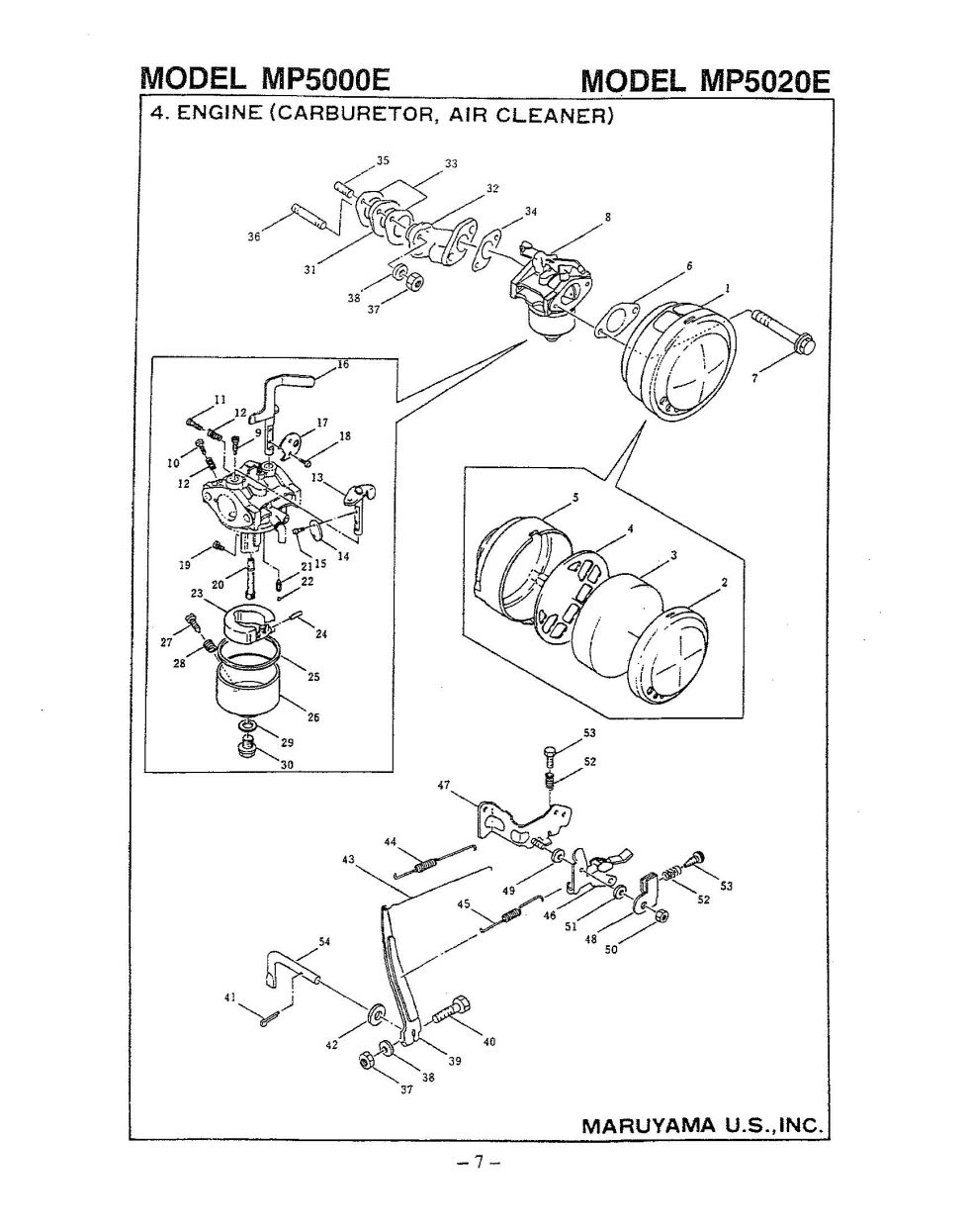 Thank you for shopping at MaruyamaParts.com and for using the parts lookup system to find parts for your MP5000E, MP5020E. You have selected the Engine (Carburetor, Air Cleaner) diagram for the Maruyama MP5000E, MP5020E Water Pumps. Below you will find an interactive part diagram for the MP5000E, MP5020E Engine (Carburetor, Air Cleaner). If you find the part in the diagram you need you may click on the item number in the diagram or find it in the parts list below the diagram. For the MP5000E, MP5020E parts not shown in this diagram you may select from one of the other MP5000E, MP5020E part assemblies or select a different Water Pumps altogether. Thanks for shopping with us at MaruyamaParts.com and for making us your source for Maruyama Water Pumps parts.
