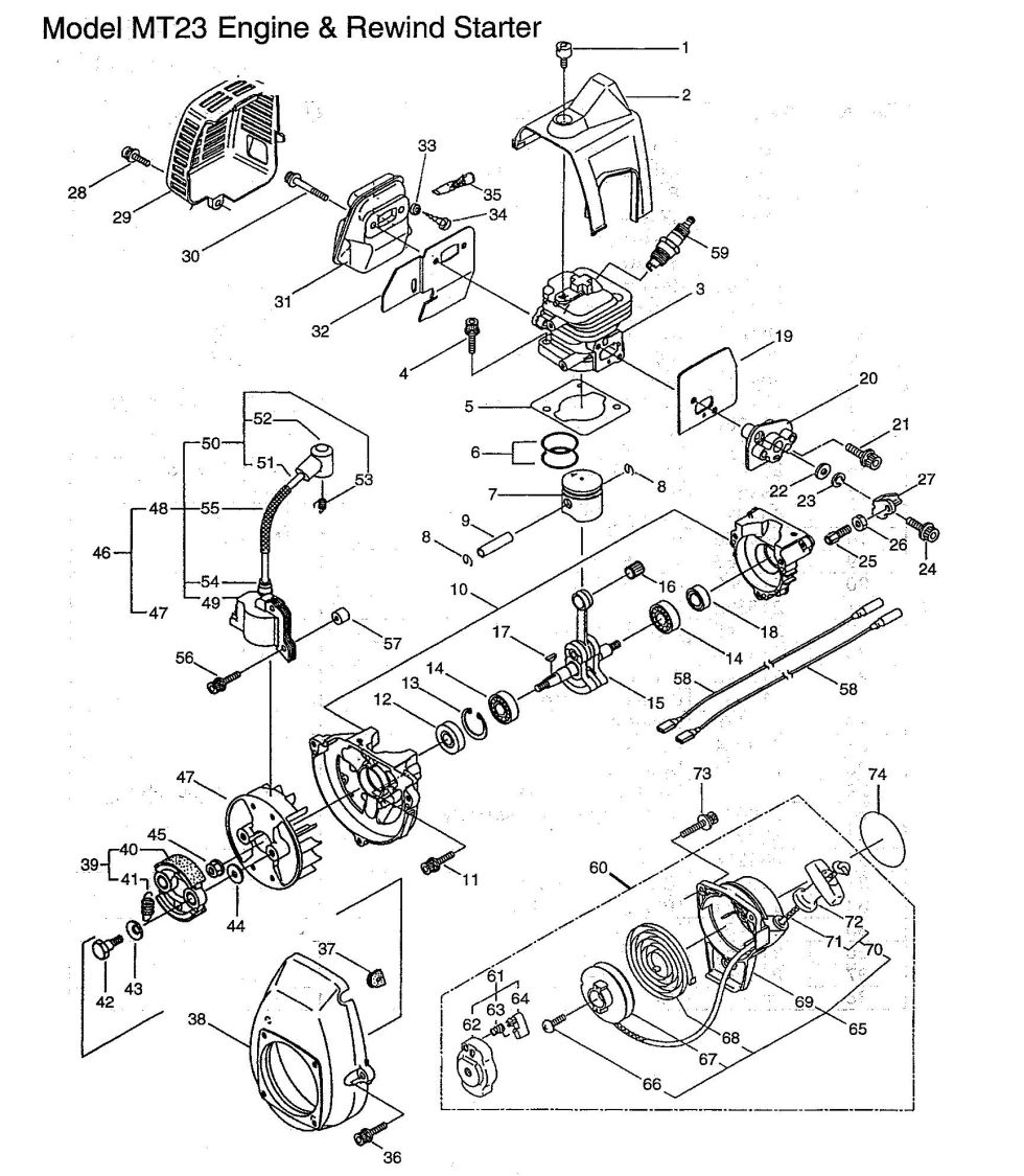 Thank you for shopping at MaruyamaParts.com and for using the parts lookup system to find parts for your MT23. You have selected the Engine diagram for the Maruyama MT23 M-Line Equipment. Below you will find an interactive part diagram for the MT23 Engine. If you find the part in the diagram you need you may click on the item number in the diagram or find it in the parts list below the diagram. For the MT23 parts not shown in this diagram you may select from one of the other MT23 part assemblies or select a different M-Line Equipment altogether. Thanks for shopping with us at MaruyamaParts.com and for making us your source for Maruyama M-Line Equipment parts.